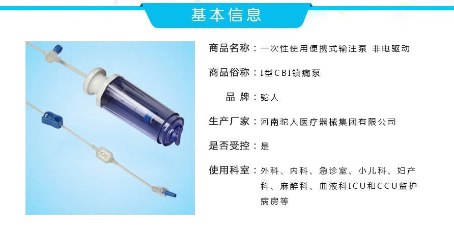 | 商品名称: | 一次性使用I型CBI输注泵 | 商品俗称: | I型CBI镇痛泵 |